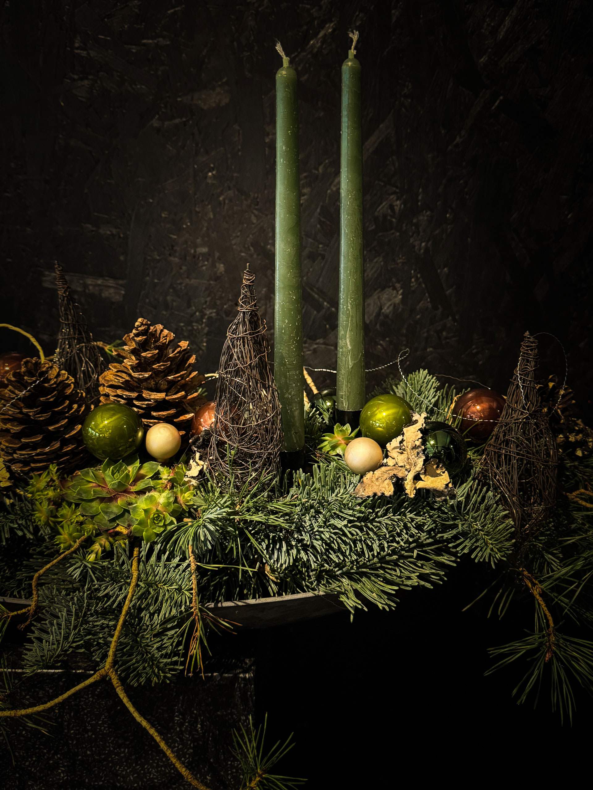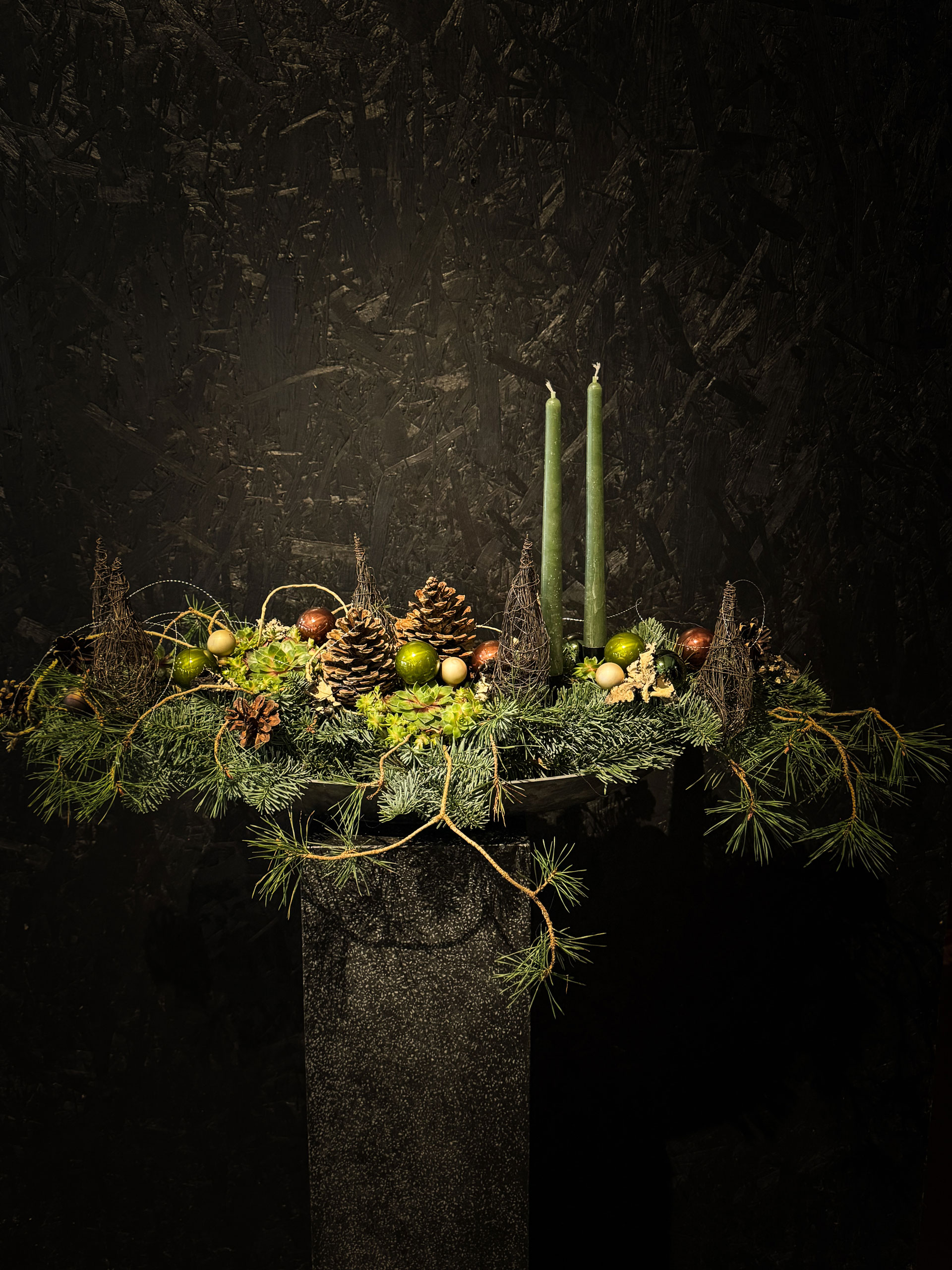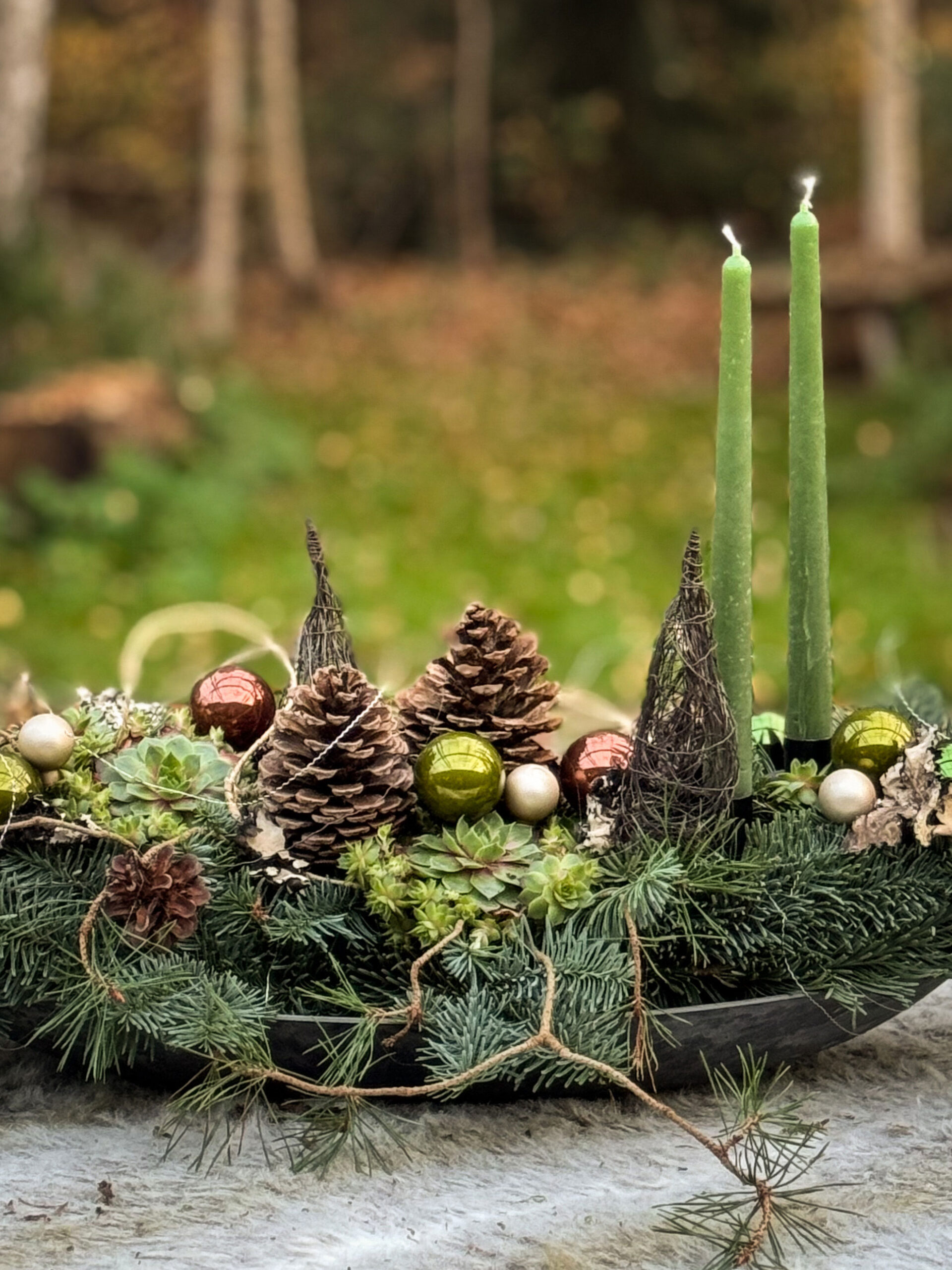 Creëer je eigen sfeervolle kerst tafelschikking met groene en natuurlijke materialen. In een prachtige bootvormige schaal werk je met diverse groensoorten, dennenappels, sempervivums, bindwire en kleine kerstballen. Je maakt zelf unieke kerstboompjes van draad en voegt sfeervolle kaarsen toe voor een warm, natuurlijk geheel. Een creatieve en gezellige workshop vol inspiratie, met koffie, thee en iets lekkers inbegrepen.
